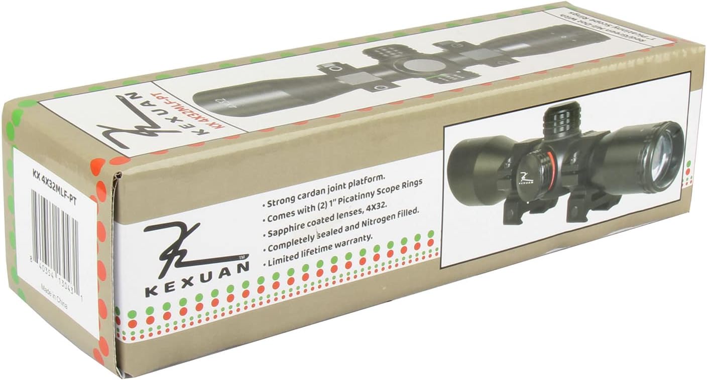 The 4x32mm compact Multi Reticle crossbow scope is constructed of one solid piece of T6 6061 aircraft grade aluminum body. It is fog proof with shock resistant housing, nitrogen purged and O-ring sealed. Blue fused, multi-coated & scratch resistant lens for optimal light transfer & best clarity. This compact scope is great for use in close quarter combat and for fast target acquisition. Includes a set of 1" picatinny/weaver scope rings and Lens Covers Dual Color Illuminated Red and Green Magnification: 4X Objective: 32X Tube Diameter: 1" Eye Relief: 3" Exit Pupil: 8mm FOV: 36.6' MOA: 1/4 Length: 8.5" Net Weight: 11.4 oz. Color: Black Material: Anodized aircraft grade aluminum