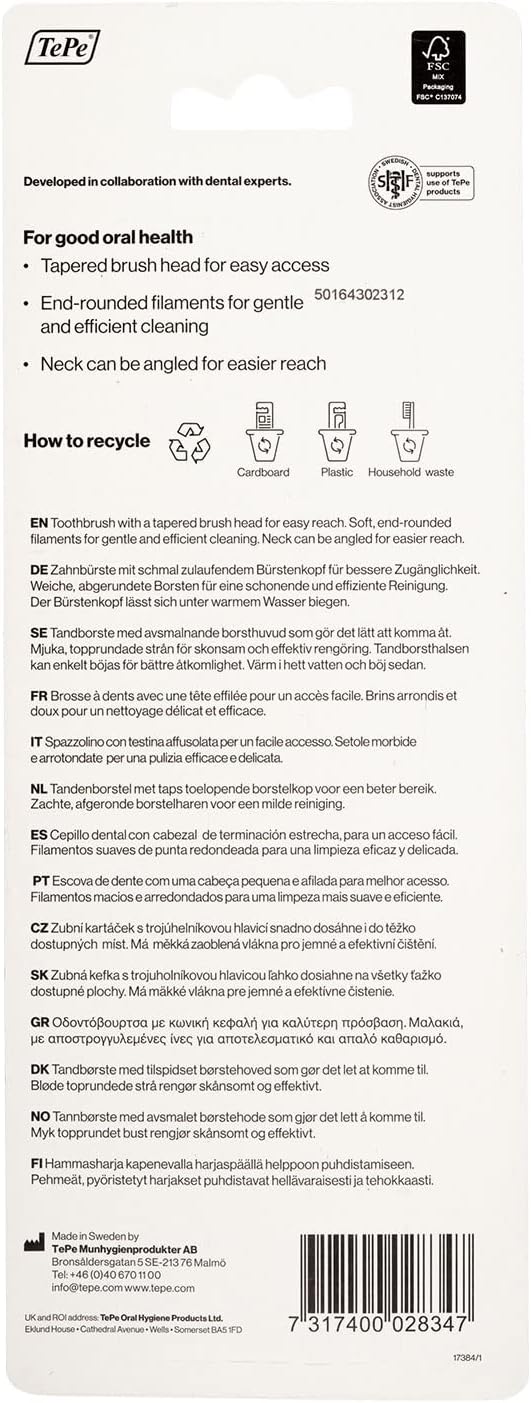 Take control of your dental hygiene with the TePe Colour soft-bristle toothbrush. Available with soft bristles and a regular-size handle or with extrasoft toothbrush bristles and a compact handle, our specialized soft toothbrushes for adults and older children are specifically designed to help reduce plaque by cleaning hard-to-reach spaces with a gentle touch. With a plastic handle and rounded bristles for safety and comfort, this soft toothbrush will help make your oral hygiene routine easy and enjoyable. The ergonomic handle gives you total control of your movements as you brush, while the tapered brush head improves access. Choose your favorite combo of colors for both the handle and bristles. The color selection may vary depending on availability.Use this manual toothbrush for precision cleaning with a soft touch. The frequency of use is based upon individual needs and recommendations. If you need customized access and even better reach, you can adjust the brush head angle after heating it in hot water.With over 50 years of experience in oral health, TePe Oral Health Care strives to develop products for long-term well-being and a better quality of life. We consider our responsibility to people and health throughout the entire innovation process. We know that it’s important to choose the right oral-hygiene products, and we use our clinically based knowledge and collaboration with dental professionals to provide solutions that help make that choice easier.