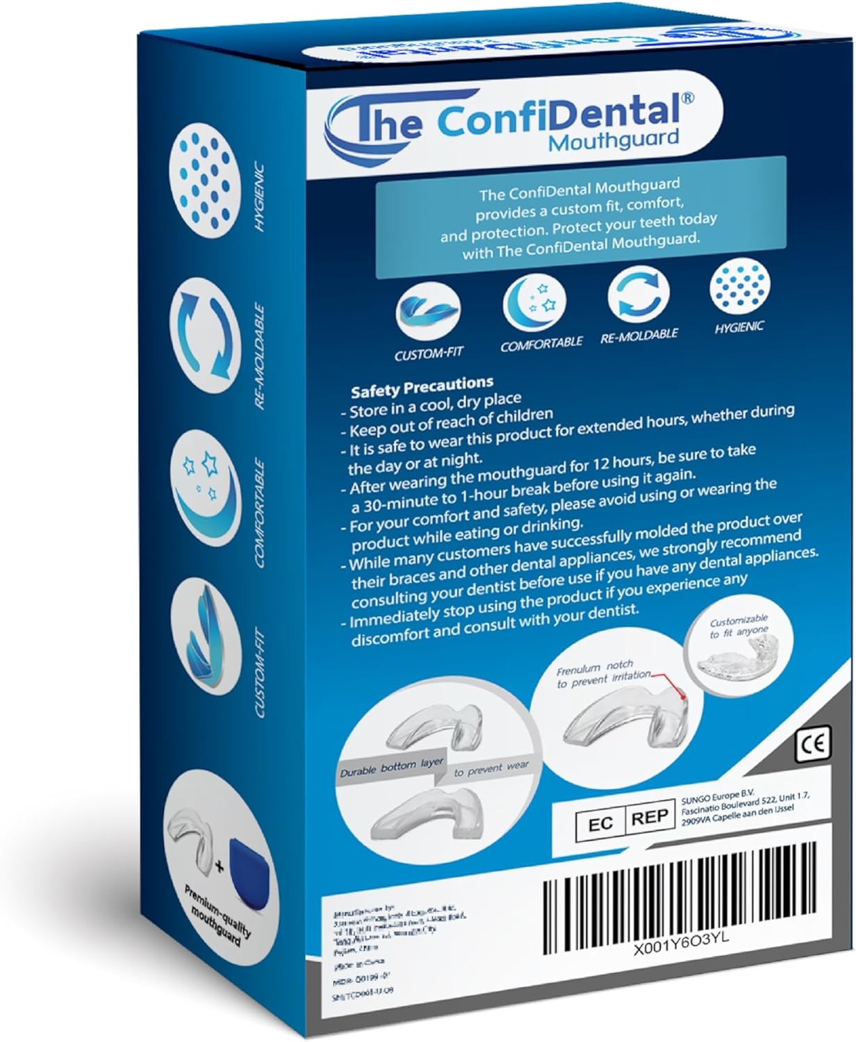 The ConfiDental Moldable Mouthguard - Pack of 3The Kit Includes:2 pieces of 3mm thick 6.5cm x 5.4cm x 1.8cm (LxWxH) ConfiDental Dental Guards1 pieces of 6mm thick 6.5cm x 4.5cm x 1.8cmConfiDental Dental Guards1 Travel Hygiene CaseStep-by-step instructions for the molding and fitting processOur high quality professional mouthguard is an excellent dental appliance. For a better prevention, our mouthguard is made from soft thermo plastic premium medical grade BPA Free and Phthalate Free material. It’s comfortable for you to use it every day and night. Our guard is the best solution for teeth grinders. It protects both your upper (top) and lower (bottom) teeth. In addition, it can be used for a whitening tray in teeth whitening treatments. With the slim (thin) design, our mouth guards provide you with comfort when wearing it.Each package comes with 2 Regular gaurds (3mm thin) and 1 Heavy duty guards (6mm thick).Our ultra comfort mouth guard can be used as a dental protector, teeth whitening trays, and sport mouthguard.If you have problem with bruxism while sleeping at nighttime. You can use our mouth guard to prevent your teeth (tooth) in your sleep.If you want to whiten or bleach your teeth, you can also use our mouthguard as a teeth whitening trays along with whitening gel in whitening or bleaching process.Whether you are men, women, mom or dad with a child, teen, kids, children, or teens with a small or large mouth, if you have teeth grinding problems, our nightguards are the best fit for you and your loved ones. You can easily mold and customize the gaurds right at your own home with a boil water. It is adjustable to custom fit your mouth since It can be molded and remolded.