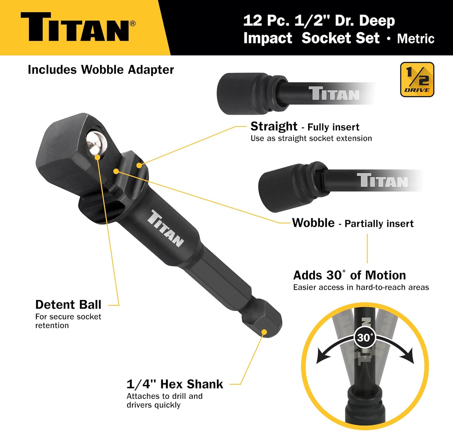Designed for use with impact drivers, impact wrenches and ratchets. The included wobble adapter is 1/2” x 65 mm long and allows for use in confined spaces with an extra 30 degrees of motion, or can be used in the straight position. Chrome vanadium steel construction for strength and durability. Black phosphate finish resists corrosion for longer socket life. Includes a flexible boot for convenient storage of both the sockets and the adapter