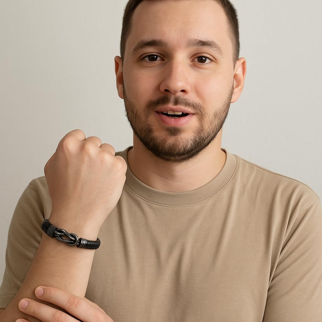 Celebrate the journey of raising an incredible son with this heartfelt "To My Son" Infinity Knot Leather Bracelet. This elegant and symbolic bracelet is the perfect way to express your love, pride, and gratitude for the wonderful man he has become. With its masculine design and powerful infinity knot symbol, this bracelet embodies the everlasting bond you share, a connection that grows stronger with time and transcends all boundaries. Crafted from high-quality braided leather and stainless steel, this bracelet is not only stylish but durable, ensuring it will stand the test of time just like the love between you and your son. The black infinity knot symbolizes the unbreakable connection, strength, and loyalty shared between a parent and son, making it a meaningful keepsake he can wear daily as a reminder of your unwavering support. The bracelet comes with a touching message card that reads, "Never forget that I love you. I sometimes wish you were still small, not yet so big and strong and tall. For when I think of yesterday, I close my eyes and see you play. Today, my son, I’m proud of you. For all the thoughtful things you do, I’ll love you till my days are done, and I’m so grateful you’re my son." These words will resonate with him every time he wears this special piece, reminding him of his childhood, your pride, and the love that knows no end. Presented in a beautifully designed gift box, this bracelet is ready for gifting on any special occasion. Whether it’s for his birthday, graduation, or simply a surprise to let him know how much he means to you, this bracelet is a lasting token of love and pride he will cherish forever. The gift box features a classic design with intricate borders, adding a touch of sophistication to this sentimental gift.
