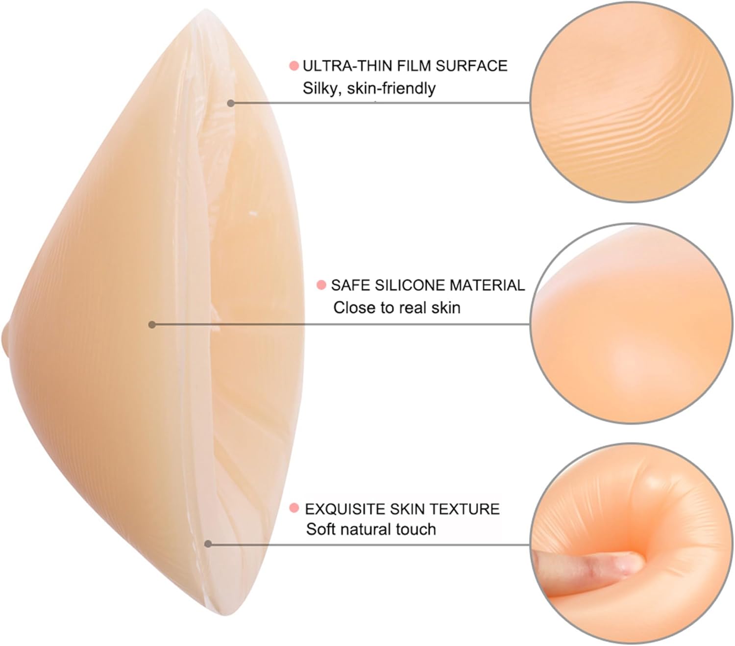 Ideal for:For drag performances, cross-dressing, cosplay, or theatrical productions.For transgender peopleFor women who have undergone a mastectomy, either full or partial, and are looking to restore breast symmetry, regain their self-confidence, and maintain a natural shape contour when wearing clothing.For anyone who wants dramatic increase in bust size without the cost and risk of surgery.Features:Safe Material: Made of medical-grade silicone, supper high elastic, ultra soft, moves naturally with the body, feel and look like the real thing.Concave Backside: Stable concave shape make it breathable and fits well for everyday use, especially designed for someone who has had a complete mastectomy.Super-thin Edges: Silicone breast forms are well-shaped to fit perfectly. They have super-thin tapered edges to blend seamlessly into the skin.Discreetly Package: Experience the convenience and privacy offered by our thoughtfully packaged product. Rest assured, your product will be discreetly delivered.How to Storage:Place them in your storage container. Do not remove the polyurethane covering, and keep them away from any sharp or hot objects.