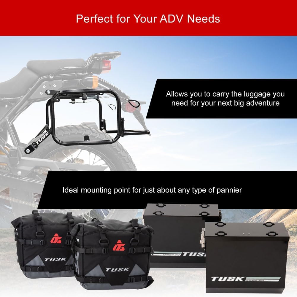 Tusk Pannier Racks are perfect for all of your motorcycle adventure needs. If you own a dual sport motorcycle and need to haul extra gear, the Tusk Pannier Racks have you covered. Made from heavy duty ¾ inch powder coated steel tubing, these racks are made to hold up. The 4 point mounting system and “bumper mount” that links both sides, ensure strength while providing protection to your subframe, side panels and exhaust. Tusk Pannier Racks feature a unique quick release system that holds your panniers securely but allows you to remove them in a matter of seconds. Whether you want to take your panniers off for a short trip or need to remove them during an overnight hotel or camping trip, the quick release system makes it simple and convenient. For safety measures, an optional included locking knob screws into the rack from the inside of your panniers. If your panniers are locked, there is no way to get them off the rack. The Tusk Saddlebag Rack is perfect for almost any type of saddlebag. The rack includes saddlebag mounting hardware that works with aluminum saddlebags or plastic Pelican-style panniers. The hoop design also makes attaching soft luggage simple as well. For the ultimate setup, check out the Tusk Aluminum Saddlebags. When you're ready to get adventure riding, Tusk is ready to make it easier and more enjoyable. - Rack mounting hardware included.