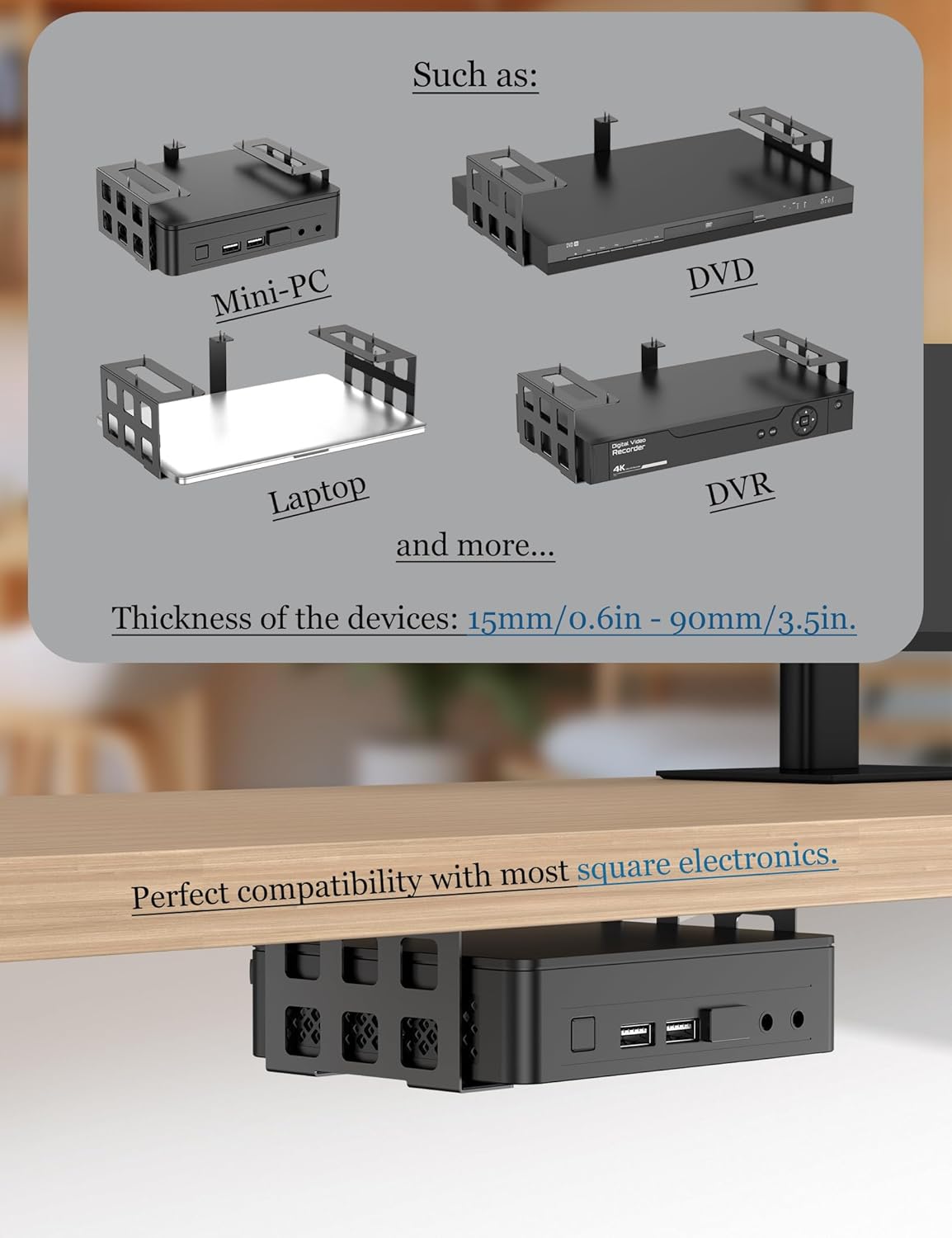 | Compatible Devices | Under desk mount perfect compatibility with video game console, such as xbox one s/xbox one x/xbox one original/xbox 360/xbox series s/ps4 original/ps4 pro/docking station/external hard drive, and any other 0.6 inch to 3.5 inch thick devices like mini projector/dvd/media players/dvr/mini pc/cable boxes/laptops/Mac Mini M4/M4 Pro/M2, audio interface, thunderbolt 3/4 dock, UPS System, dell wd19/19s/19tbs/22tb4 dock and more square electronics. |