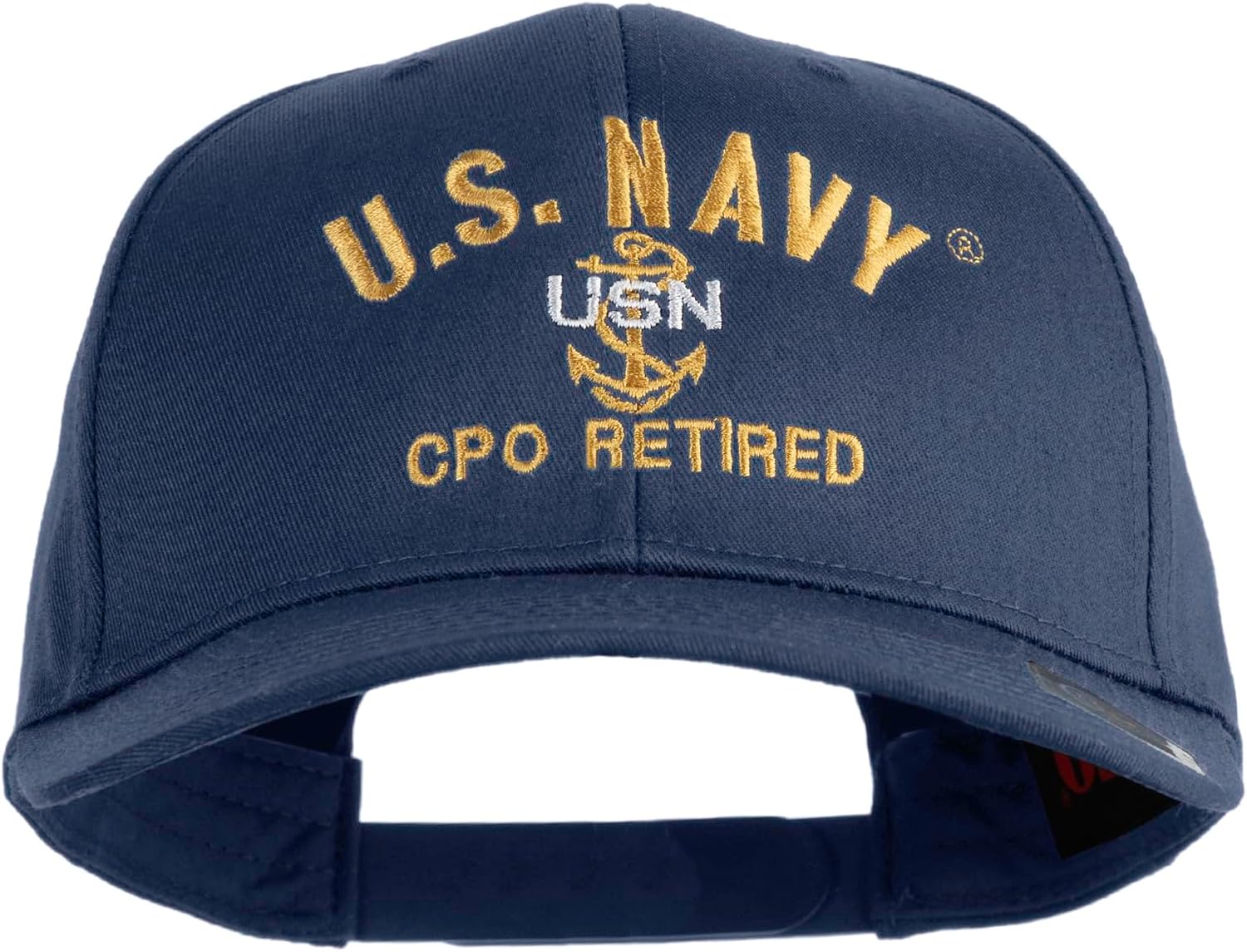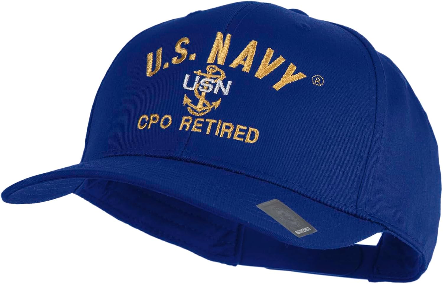 Title, US Navy CPO Retired Military Embroidered Solid Cotton Twill Pro Style CapOccasion, Ideal for Navy reunions, military events, or everyday wear that honors the leadership and legacy of a retired CPOOne Size Fit, Fits up to XL with adjustable plastic snap closurePanel Construction, 6-panel, high profile design for a classic military lookCrown Measurement, Crown measures 4 inches deepBill Features, Pre-curved bill measures 2.75 inches longMaterial Composition, 35% cotton and 65% polyester for durability and comfortDimensions, 7.5(W) x 10.5(L) x 4.5(H) inchesMaterial Feel, Thick, soft, and lightweightGender & Age, Adults/UnisexSeasonal Use, All seasonsCare Instructions, Hand wash onlyOrigin, Imported