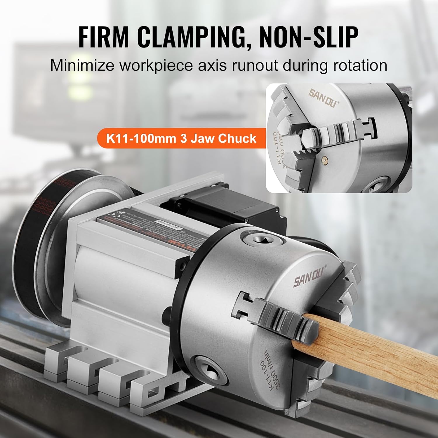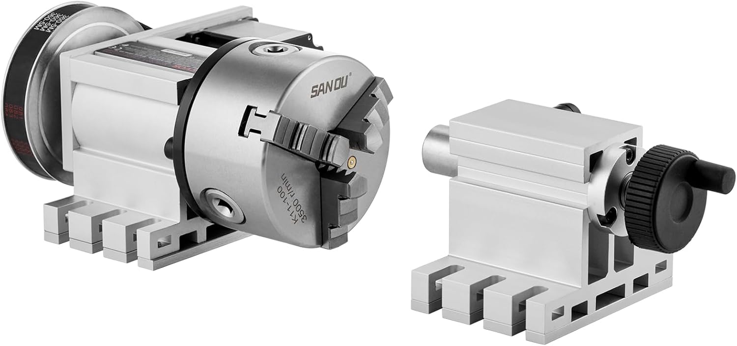 SpecificationsItem Model Number: BS4-KP100-57Center Height: 2.6"/65 mmVoltage: DC 3.75V, 2.5AChuck Type: K11-100mm 3 Jaw ChuckGear Ratio: 6:1Chuck Clamping Diameter: 0.08-1.18''/2-30 mm(Internal Jaw), 1.18-3.15''/30-80 mm(External Jaw)Net Weight: 17.6 lbs /8 kgPackage Content1 x Dividing Head(With Chuck)1 x Tailstock1 x MT2 Rotate the Thimble3 x Card Plate Anti-Claw1 x T-wrench1 x Numerical Control Cable1 x User Manual