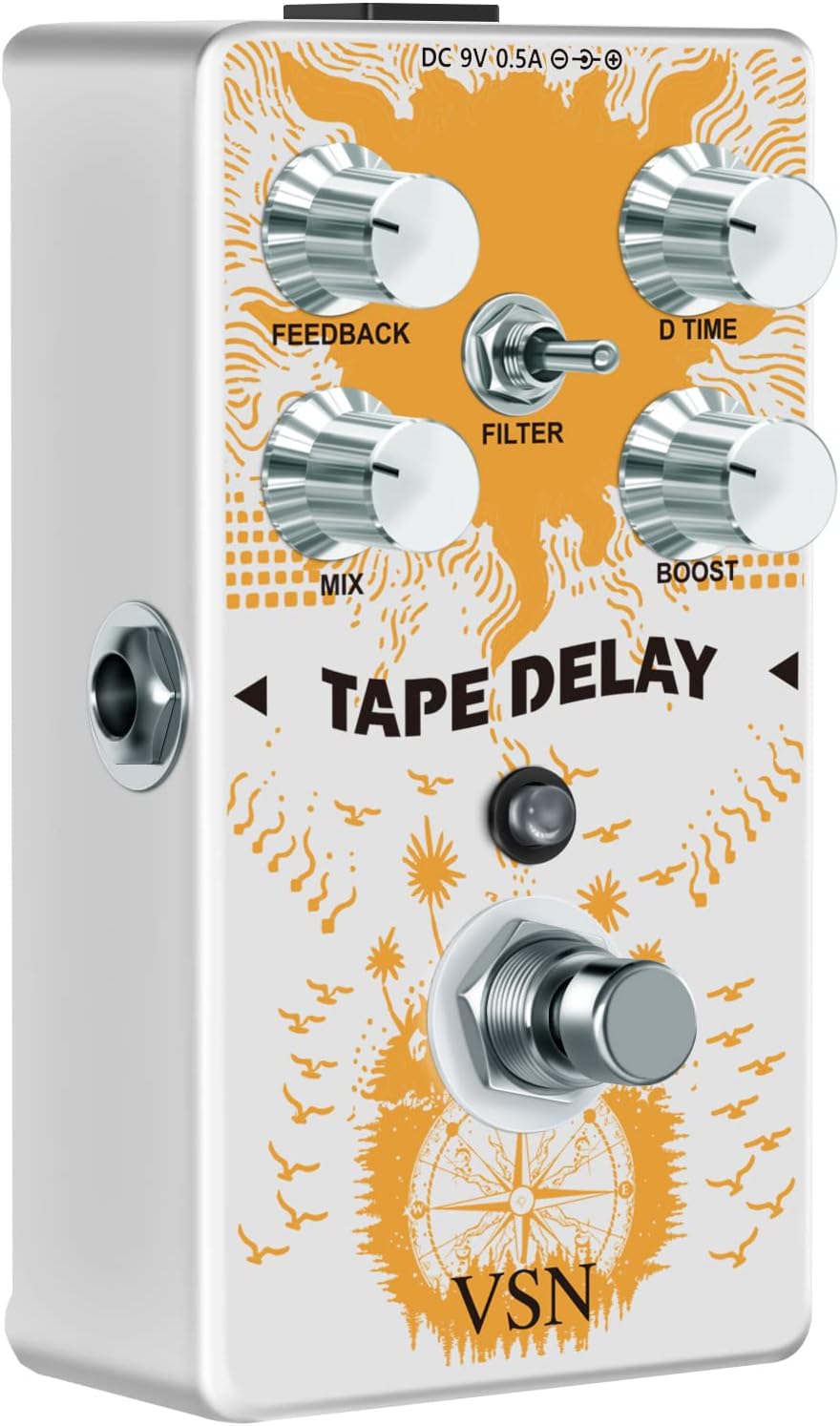 🌟🌟🌟Description:♫♫ This Tape Delay effect pedal has a grainy delay effect.At the same time, it can be combined with the Filter modulation shift to bring a reverb-like sound; the warm and husky sound is very suitable for some nostalgic music ♫♫ The original dry signal will become stereophonic and rich. It uses a digital reverberation processing chip and the analog signal is input to the chip and then converted into a digital signal after delay and superposition , eventually digitally converted into analog audio signals for output, with a wider dynamic range. ♫♫ If you need extra volume, you can turn on the BOOST switch. A maximum of 6dBs of extra volume can be provided to put you at the center of the stage🌟Features:1.Power Supply:9V DC (Negative in the center).2.FILTER Knob: Adds fltering to the delayed signal.3.BOOST Knob: 0 - 6dB volume adjustment.4.D TIME Knob: controls delay time.5.FEEDBACK Knob: Adjusts the number of echoes.6.MIX Knob:Controls the mixing ratio of dry and wet signals.7.Input & Output Jack:Analogy though 1/4’’ mono audio jack.8.LED indicator light :Green light: Normal mode, can use knob to adjust parameters;Red light: Fixed mode,ffector use the fixed parameter, knob can't be use;Go out: Original sound9.Full metal shell:High quality zinc alloy classic, stable and strong.10.True BYPASS Footswitch : Press once: Switch between original sound and effect sound;Press twice: Switch between fixed mode and normal mode;Longtime Press : Store the current parameters.