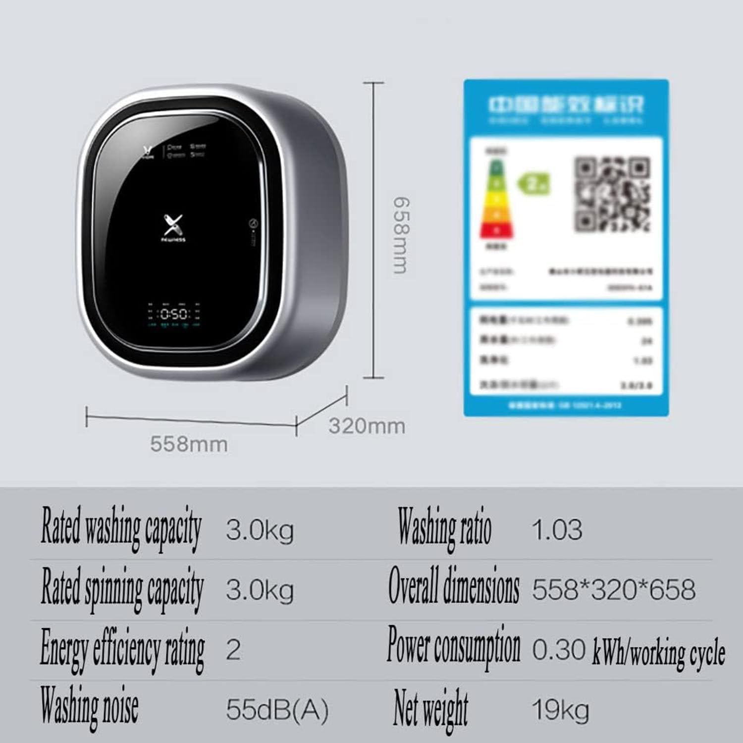 It's raining outside again, don't worry, our compact household dryer will be useful for you at any time. No longer fear the rainy season and smoggy days. To give your baby more professional care, with a wide range of baby clothes, special ad hoc multiple washing modes to refine washing, bringing a more professional washing experience. Small portable fully automatic washing machine, Ideal for camping trips & RVs, apartments, & boats or dorms, our clothes washer is compact but powerful, It's easily stored or moved in small spaces. Feature: Mini and compact, energy-saving, suitable for cleaning women's underwear and baby products. Efficient sterilizations, cleaning and nursing are healthier. Efficient cleaning and Low noise. Specification: Product name: Wall mounted washing machine Rated Washing Capacity: 3.0kg Rated Spin Capacity: 3.0kg Washing noise: 55dB(A) Dehydration noise: 65dB(A) Rated voltage / frequency: 220V~/50Hz Rated washing input power: 50W Rated spin input power: 125W Rated total washing and heating power: 1450W Water consumption: 24L/working cycle Power consumption: 0.30(kWh/working cycle) Washing-to-cleaning ratio: 1.03 Product dimensions: W558xD320xH658 mm Net product weight: 19kg The package includes: 1 * wall-mounted automatic washing machines