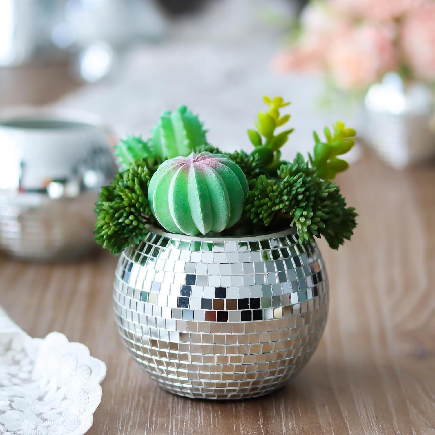 Centerpieces for Home: Use these small disco ball vases as a striking centerpiece in your living room, bedroom, or dining area. The silver disco ball can serve as a standalone decorative item or be filled with flowers, plants, or candles to enhance the ambiance. Holiday Event Decorations: Perfect for parties, weddings, chirstmas, new year, and thanksgiving, these vases can be used as disco ball centerpieces on tables, adding a festive and elegant touch to the decor. Interesting Office Spaces decor: Add a bit of flair to your office or workspace by using the mosaic disco ball vase as a decorative item. Mirror design of the silver vase can bring a sense of fun and creativity to a professional setting. Additional Outdoor Decor Features: While primarily designed for indoor use, these disco ball centerpieces can also be used in covered outdoor spaces like patios, porches, or gazebos. These mirror balls can add a unique and stylish touch to outdoor gatherings and events. Glitzy Accessories for Restaurants and Cafes: Enhance the dining experience by incorporating these mirror ball vases into the table settings or overall decor of restaurants and cafes. The disco ball vases can add a chic and modern touch to the ambiance. Gift Ideas of Disco Vase: These disco ball planters make for a unique and thoughtful gift for housewarmings, birthdays, holidays, or any special occasion. Its stylish design and versatile use make the disco room decor a delightful present for friends and family.