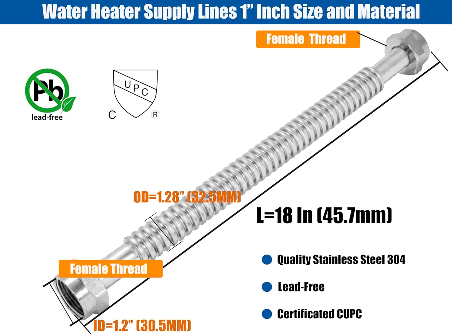 WHK 2 Pack Corrugated Flexible Stainless Steel Water Heater Connector Line 1" Inch FIP x 1" Inch FIP to Connect Water Heater,Water Softener,Water Filter and Stock Tank Hot Tub