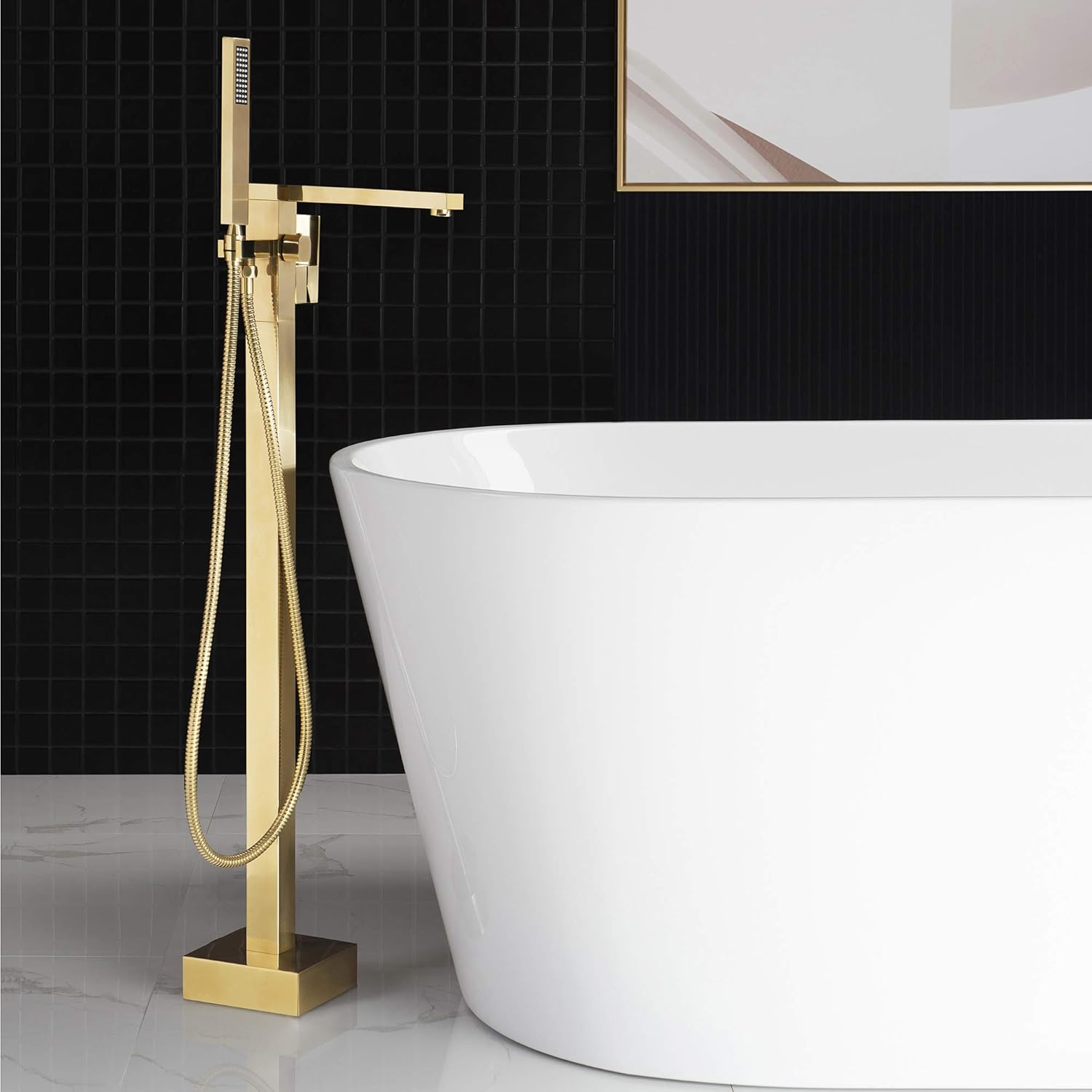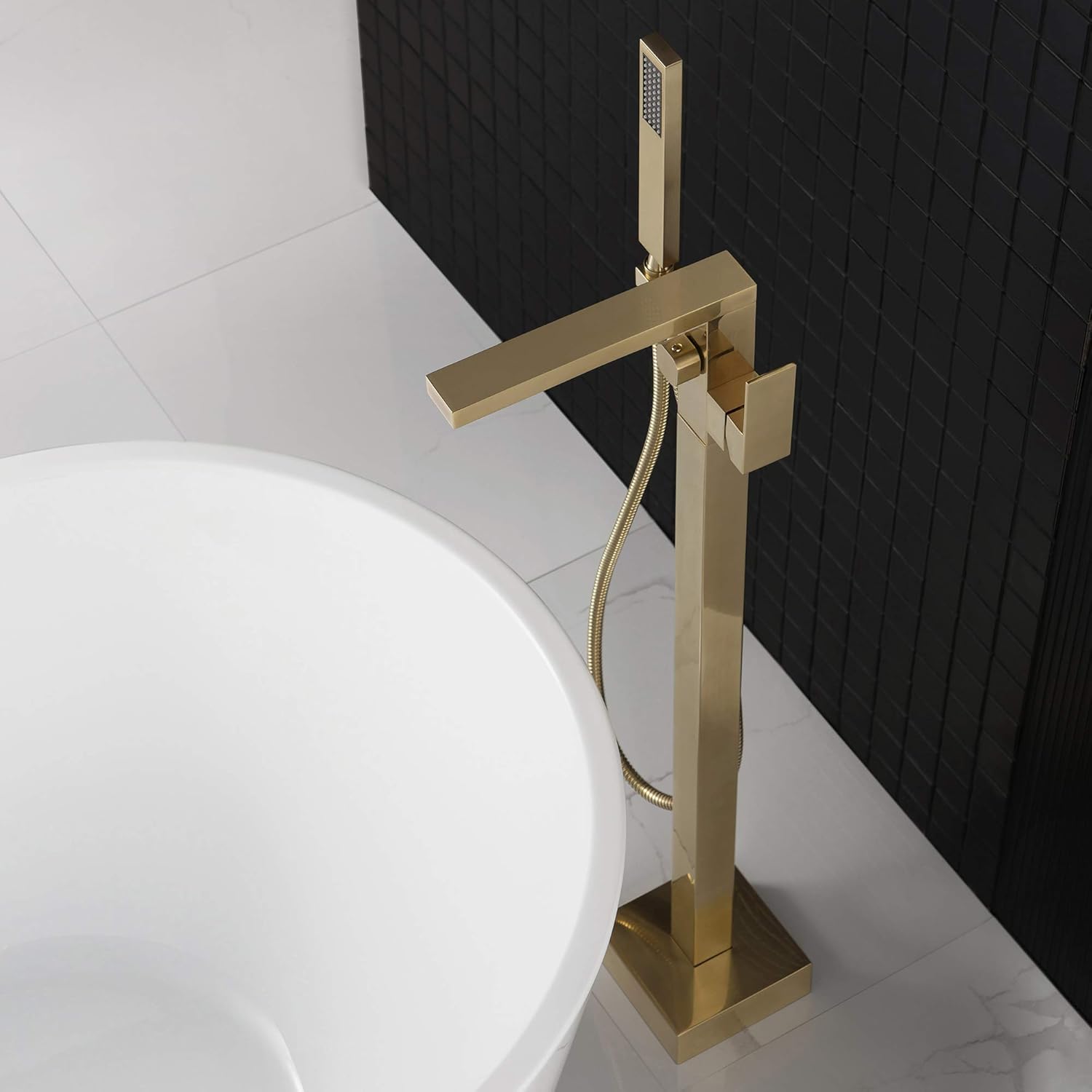 Contemporary freestanding floor mount tub filler faucet with telephone style hand shower, Fine artistic craftsmanship, Made from solid brass construction for reliability and better for hard water condition. Standard US plumbing 1/2" IPS connection SPECIFICATION_1 : Solid brass is the most durable and reliable material that frequently used in plumbing industry. Mostly because they are better for hard water use and less likely to corrode or rust after years.SPECIFICATION_2 : Drip free ceramic disc cartridge with built in sediment filter; durable seals and ceramic shell prevent leaks and promote smooth operation and functionality for over 500,000 uses. It is more reliable and durable than any lower cost washerless or ball valve cartridge that widely used in plumbing industry.SPECIFICATION_3 : Single lever handle design allows flow rate and temperature control in one handSPECIFICATION_4 : High quality NEOPERL coin slot aerator control the straightness and diameter of the water stream while reducing noise, splashing, and side spray by aerating the water as it exists the faucet. Also they save water, reduce energy costs and filter sediments while meeting local plumbing code. Easy removal using any coin to clean any debris or mineral on screen after daily use and reuse it. SPECIFICATION_5 : The dual functionality of our detachable sprayer is the perfect tool for all your bathing needs including rinsing your hair, washing children or pets, and also for keeping the tub clean after use. When finished, simply slip the sprayer back to its secure dock. SPECIFICATION_6 : Our high quality brass tripod base, which comes standard with expansion bolts for install on concrete, allows for easy and stable installation while seamlessly allowing for water supply to pass through.