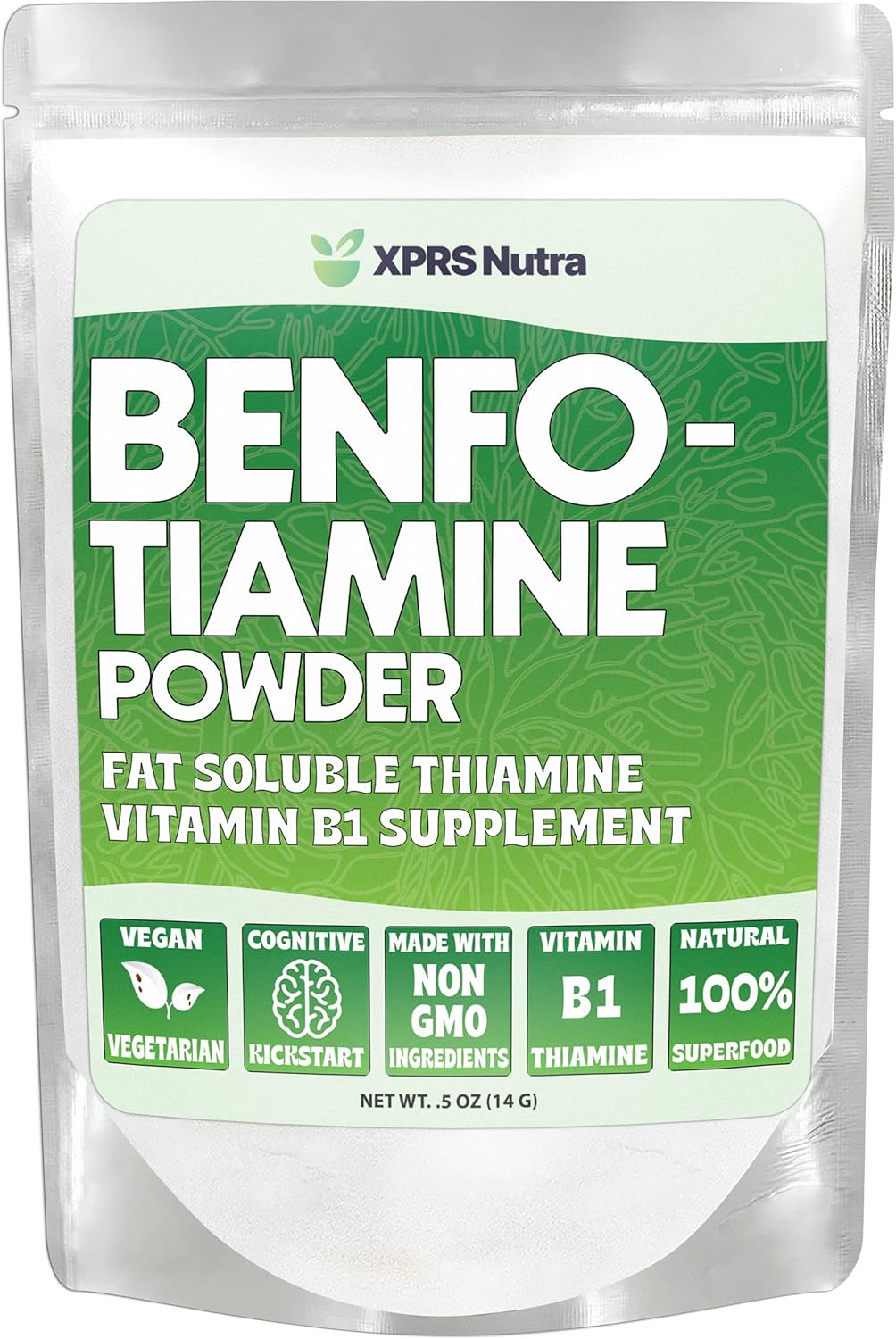 Total Body Support: Benfotiamine is a fat-soluble derivative of Thiamine (Vitamin B1). Benfotiamine 150mg is beneficial in maintaining healthy cells. This vitamin will mix into liquids easily and is quickly digested and absorbed into the body. Easily Absorbed: Did you know that some people's bodies have a hard time absorbing Thiamine? That's where Benfotiamine can assist. It is a fat soluble vitamin B1, so it is more easily absorbed into the body. Once absorbed in the bloodstream, it releases thiamine. Be sure to do your research on this remarkable fat soluble B1 thiamine so you understand its benefits. For Your Health: Benfotiamine stays in the body four times longer than traditional water-soluble vitamin B1. Make sure to do your research so you understand the benefits of vitamina b1 benfotiamine. Now it's easier than ever to make your own benfotiamine 150 fat soluable b1 drinks at home. Support Focus and Concentration: Try our benfotiamine advanced formula. We take great care to ensure that we are sourcing our benfotiamine 600mg thiamine from trusted suppliers. This benfotiamine 300mg is pure, loaded with nutrients, and contains no additional ingredients. Love Your Benfotiamine: We love the superior quality of our thiamine benfotiamine. Here at XPRS Nutra, our first priority is ensuring that we are providing our customers with premium products in an ethical manner. We are committed to providing the products you want & need at an affordable price. Try taking our B1 Vitamin Benfotiamine Thiamine daily and feel the difference!