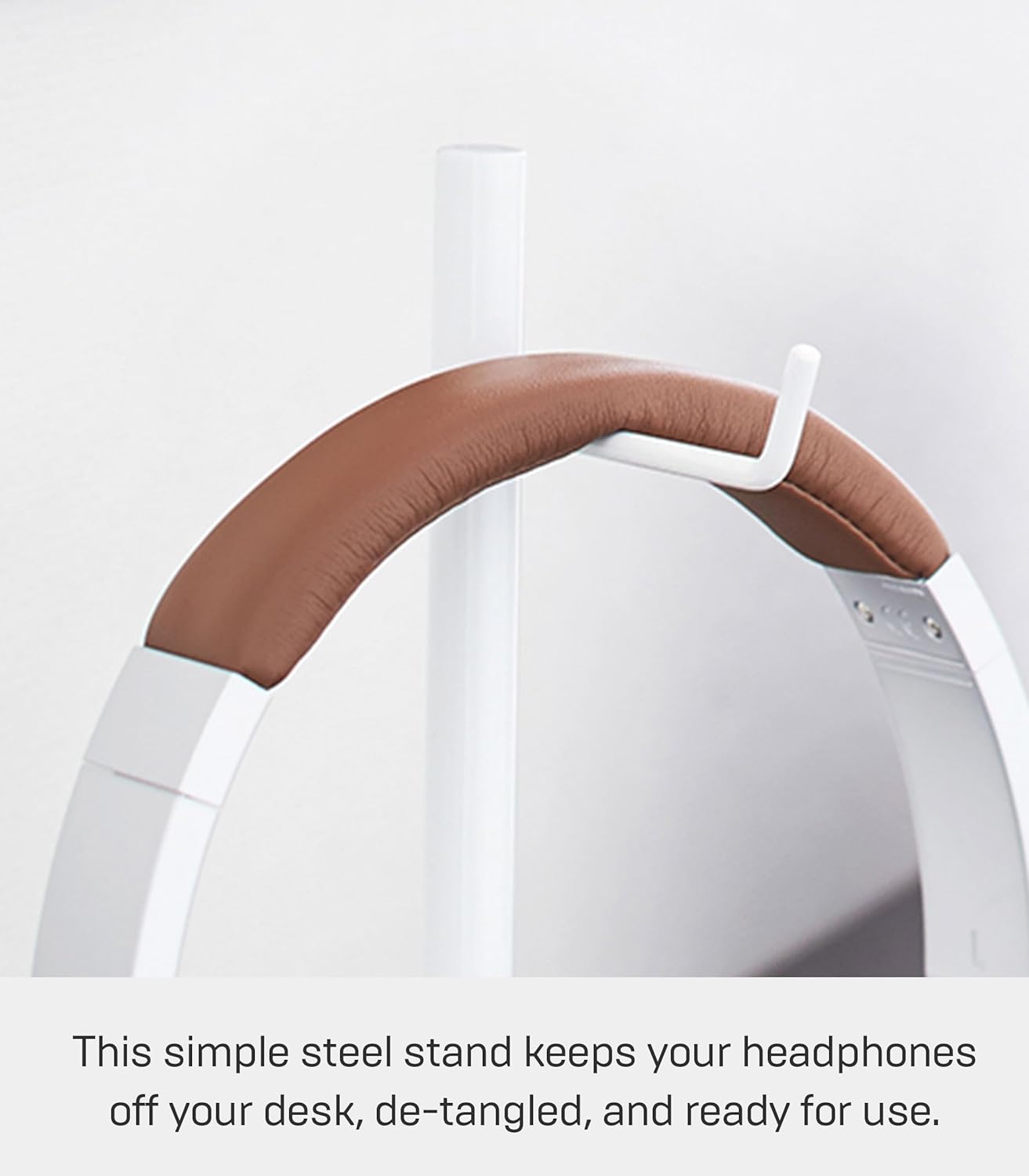 This simple upright stand keeps your headphones off your desk, de-tangled, and ready for use.