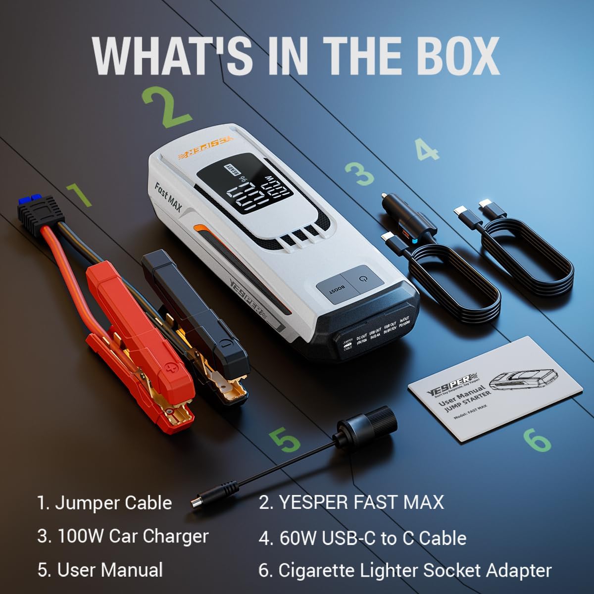 | Included Components | 1 *Jumper Cable, 1*100W Car Charger, 1*4120A Jump Starter (27000mAh), 1*60W USB-C to C Cable, 1*Cigarette Lighter Socket Adapter |