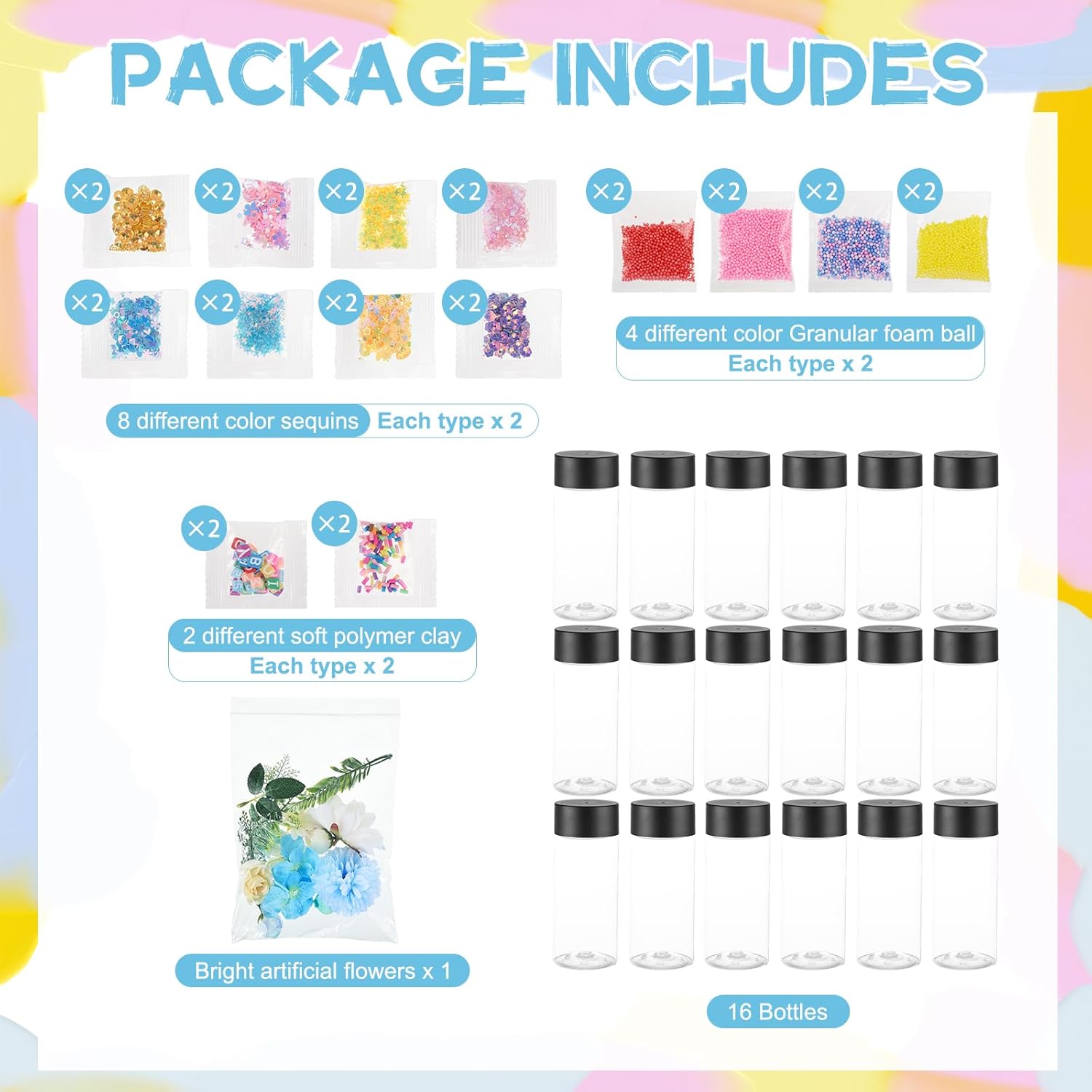 Creative DIY Sensory Bottle Kit: This 16-piece sensory bottle kit includes everything you need to create personalized sensory bottles. The set consists of plastic bottles with lids, 16 packs of colorful glitter, 8 packs of foam balls, 1 pack of artificial flowers, and 4 packs of cartoon clay pieces, offering endless creative freedom to craft visually appealing decoration bottles.