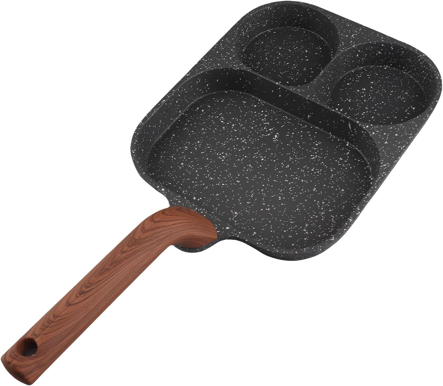 1. NON STICK DESIGN: This egg frying pan is coated with non stick coating, it is not easy to stick to the pan when frying eggs, steak and other foods, and it is more convenient to clean. 2. 3 SECTION DESIGN: This egg pan is designed with 3 sections, with two round cups and a rectangular section, you can fry bacon, eggs, pancakes and steaks separately, convenient and efficient. 3. FLAT BOTTOM: The breakfast cooking pan is designed with a flat bottom, which conducts heat evenly for more even cooking, and the food is easier to stir fry and saute, making cooking easier. 4. ANTI SCALDING HANDLE: Our egg frying pan comes with a removable handle, which is comfortable to hold, heat resistants and safe, preventing scalding, and trustworthy. 5. BLACK DESIGN: Egg frying pan is designed in black color, which looks stylish and adds to the kitchen decoration. Best for making a quick and delicious breakfast. Spec: Item Type: Egg Frying Pan Material: Aluminum, Phenolic Plastic Pan Size: Approx. 26.3 x 19.5cm / 10.4 x 7.7in Handle Length: Approx. 18cm / 7.1in Color: Black packing list: 1 x Egg Frying Pan 1 x Handle Notice: Manual measurement, please allow some errors.